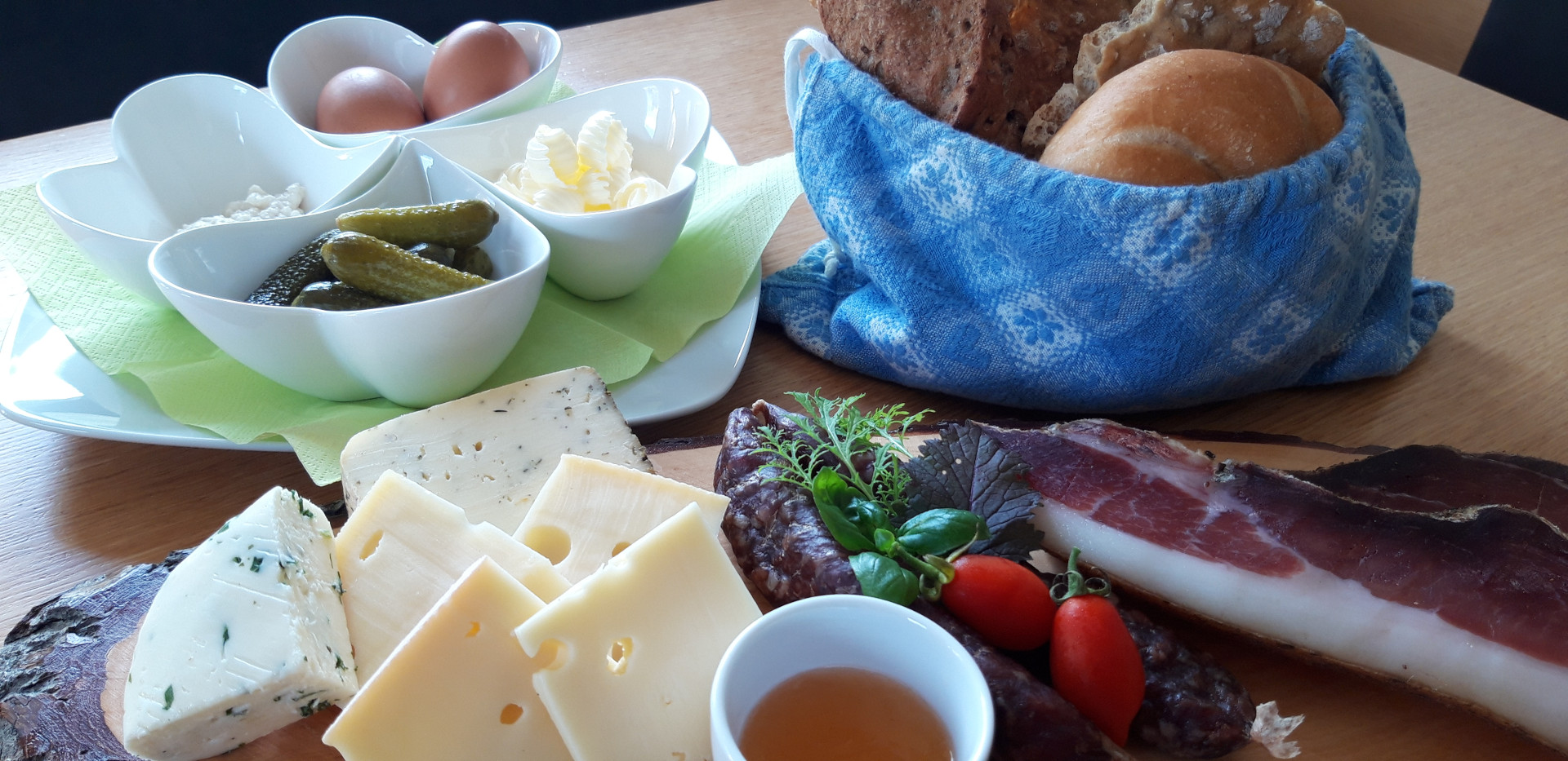 Il nostro pane di produzione propria è realizzato con farina di segale. Le spezie del nostro pane sono composte di anice, fieno greco e coriandolo. Altri ingredienti necessari sono il lievito, sale ed acqua. Lo speck e i salami affumicati vengono prodotti da noi stessi come da vecchia ricetta e tradizione. Il burro ed il formaggio sono prodotti in Alto Adige. Le uovo sono delle nostre galline.